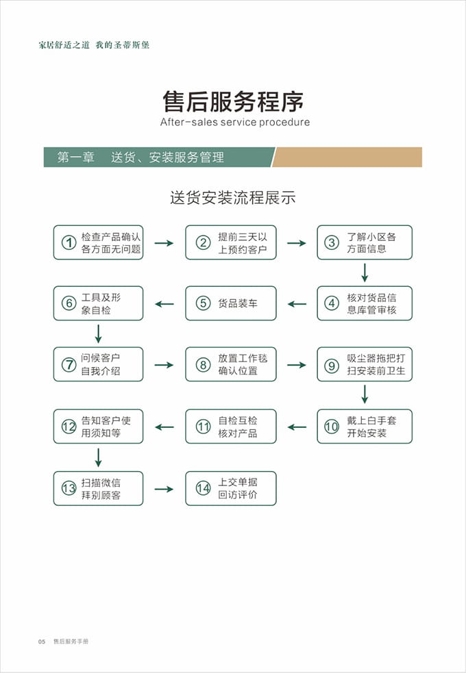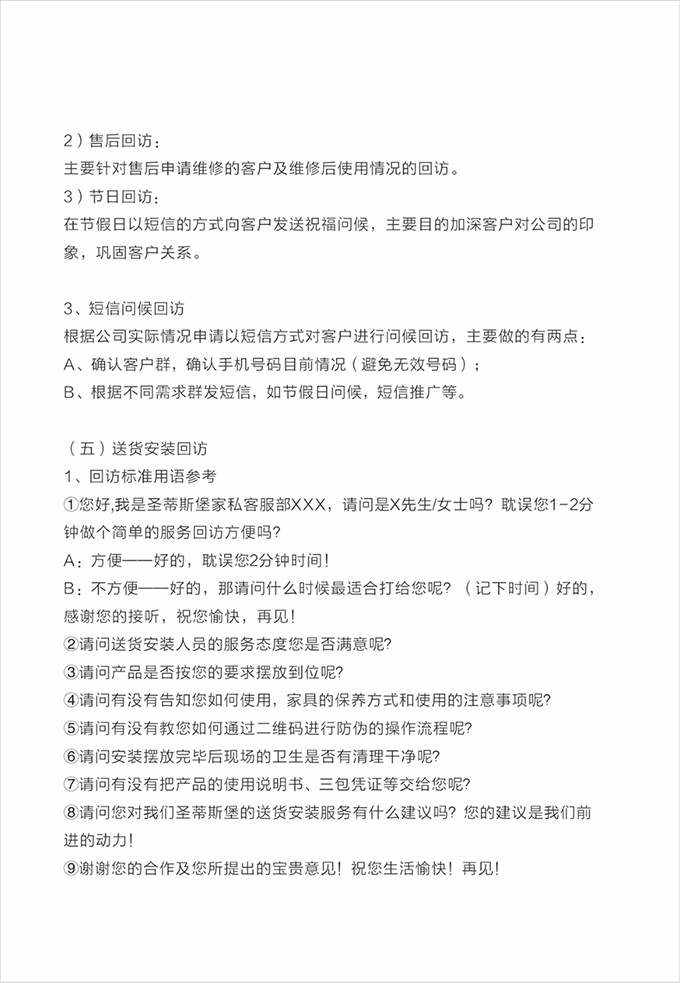 話術(shù)參考:“**先生/女士您好,我是圣蒂斯堡的售后服務(wù)人員**,您購買的圣蒂斯堡家具已經(jīng)全部到貨了,送貨安裝大約需要**時(shí)間,請(qǐng)問您這邊什么時(shí)候方便我們上門送貨安裝呢?”同時(shí)要了解送貨小區(qū)的電梯、樓道、入戶門的尺寸等,提前做好準(zhǔn)備,避免意外情況。最后確定送貨時(shí)間(安裝所需要時(shí)長),并告知客戶安裝人員的相關(guān)信息,可加微信發(fā)送,并發(fā)送配送安裝流程說明。
