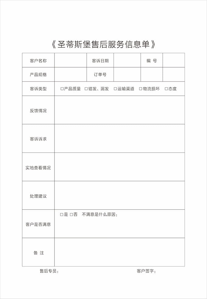 現(xiàn)場修復(fù)完成后,請(qǐng)客戶確認(rèn),在《圣蒂斯堡售后服務(wù)信息單》上簽字;不能現(xiàn)場修復(fù)時(shí)則必須跟客戶說明清楚,征得客戶同意后將產(chǎn)品帶回處理或返廠處理,應(yīng)開具相關(guān)收據(jù)交予顧客,并且登記備案;修理完畢后按照配送流程送到顧客家后應(yīng)向顧客索回收據(jù),并且請(qǐng)顧客在《圣蒂斯堡售后服務(wù)信息單》簽字。