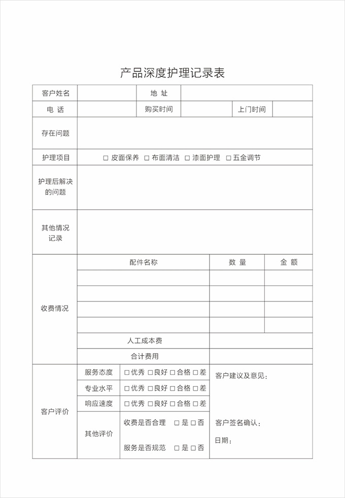 按要求認(rèn)真填寫服務(wù)記錄單據(jù)并請(qǐng)顧客填寫相應(yīng)內(nèi)容及簽字,離開顧客處時(shí)除了與顧客本人告別外,還需要向有關(guān)負(fù)責(zé)人打招呼,詢問是否還有其他問題,當(dāng)?shù)玫筋櫩偷臐M意允許后,方可離開。