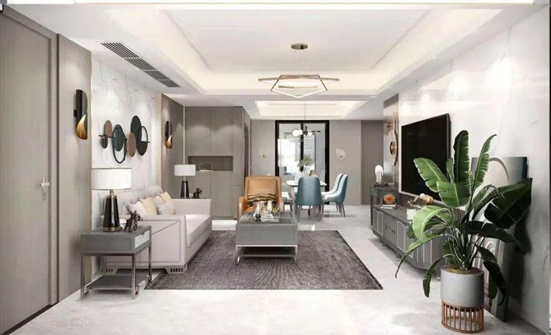 ▲設(shè)計師巧妙的運用填充藝術(shù),將客廳電視與沙發(fā)背景色彩相呼應(yīng),利用凹凸互補的設(shè)計手法,傳遞著空間時尚。莫蘭迪實木家具,配以同色系的高級金屬底座,將精致輕奢從細(xì)節(jié)中脫穎而出。