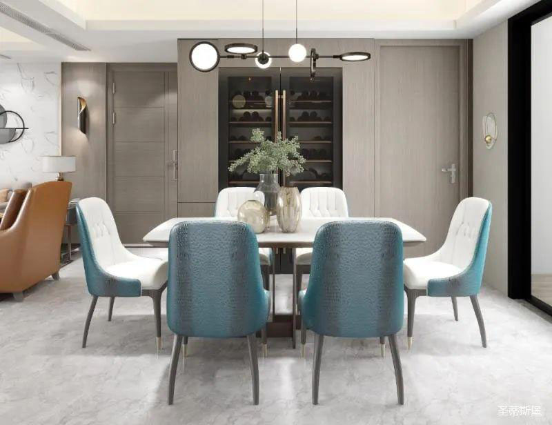 ▲澄亮湖藍(lán)的餐桌椅,一定是空間的點睛之處,溫柔跳脫的色彩,賦予了生活多姿多彩的體驗。經(jīng)典黑的簡約燈飾,在不忘溫馨氛圍的同時,也引領(lǐng)著造型界的時尚潮流。