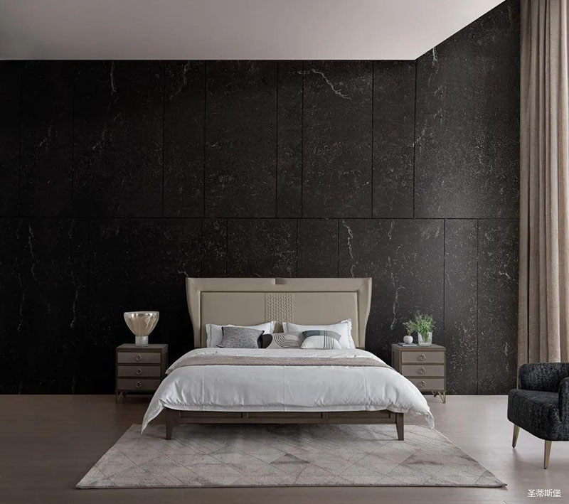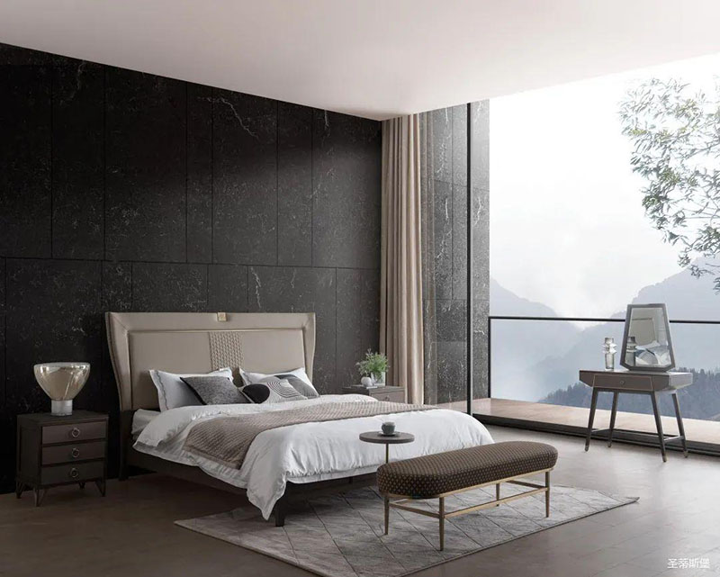 次臥床頭背景沿用了暗色大理石護(hù)墻,空間層次分明,簡約時(shí)尚的米色床屏糅合金屬鑲嵌與真皮編織藝術(shù),看似舒適隨意,卻在極簡中透著淡淡的奢華感。大面積的落地窗讓自然光傾入室內(nèi),拉上與床屏同色系的窗簾,令次臥的室內(nèi)空間明暗有度。
