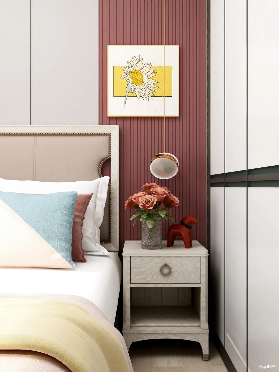 兒童空間雖不及其他空間寬敞,但細(xì)節(jié)設(shè)計(jì)更為貼心,淡粉的床屏與酒紅木飾面形成深淺色的對(duì)比,色彩跳躍,洋溢著兒童應(yīng)有的青春活力。床前的閱讀燈,讓空間設(shè)計(jì)感up的同時(shí),也便利了兒童的閱讀學(xué)習(xí)。