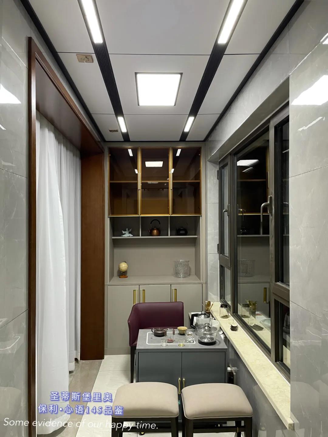 ▲餐廳一面及頂?shù)耐该鞴耋w,以簡練的金屬線條分割出收納空間,讓立面視覺更顯精致干凈。餐邊柜設(shè)置了臺(tái)面、全玻璃展示區(qū)以及隱藏收納區(qū),滿足了日常生活中多樣的收納需求。