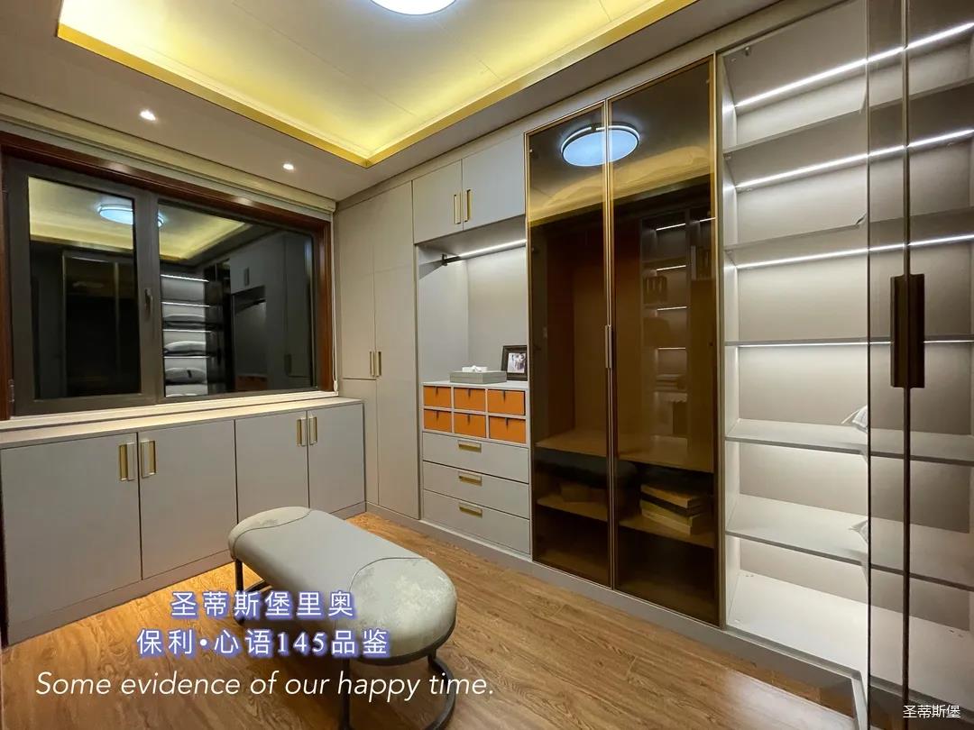 ▲衣帽間是用一間房改造的,衣柜開放式的布局處理,不但釋放了空間的狹隘,也營造出了具有觀賞性的空間格局,淺灰色調(diào)打造柜體基底,凝練出現(xiàn)代簡約的生活質(zhì)感。柜體中安裝感應(yīng)燈帶,光線流瀉其中,襯托出材質(zhì)的自然肌理,溫潤細(xì)致的實(shí)木與剛硬冷冽的低奢金屬相互交織出一個(gè)極具質(zhì)感的儲(chǔ)物空間。