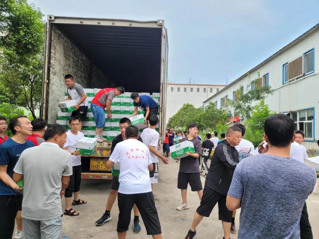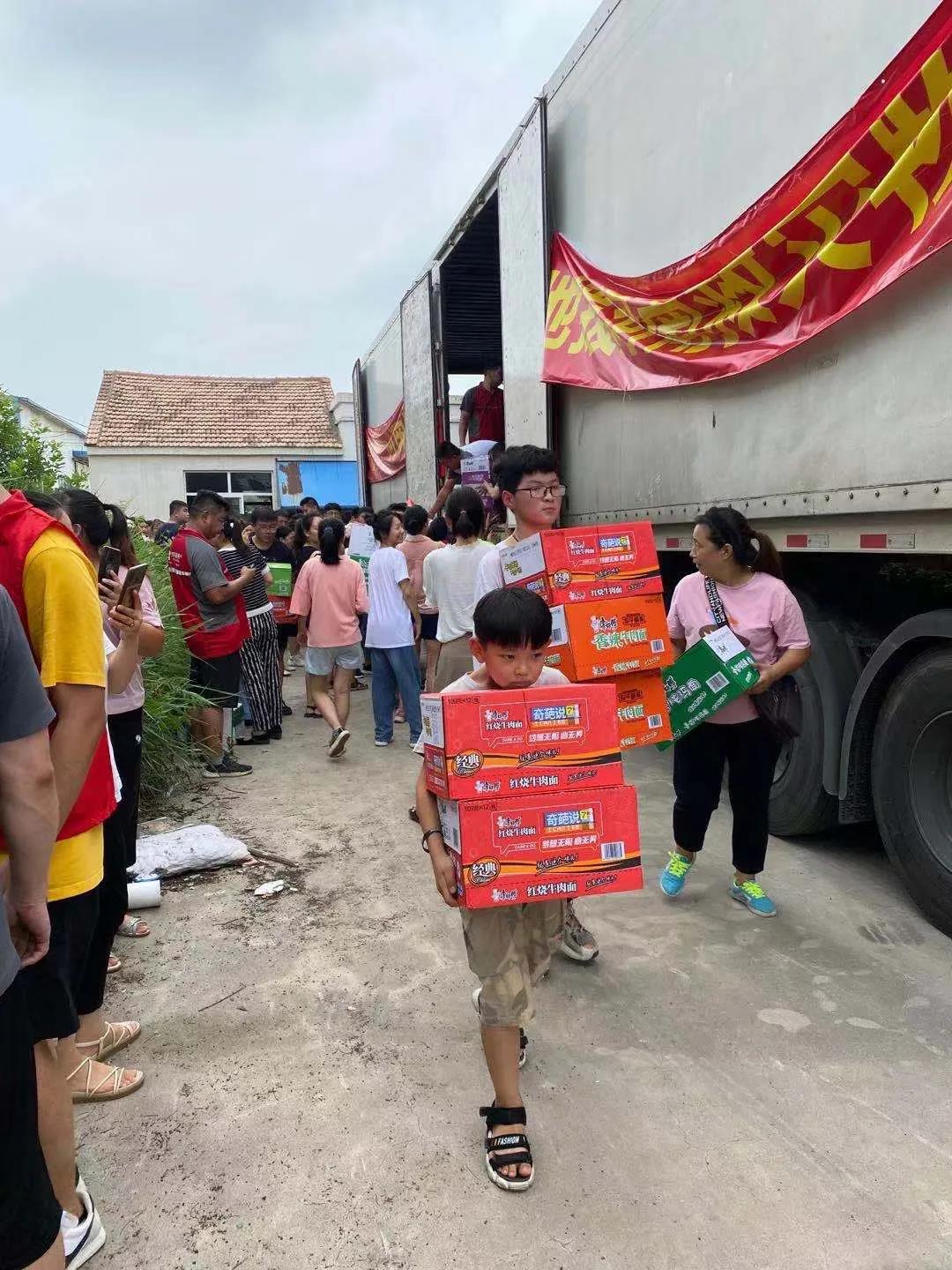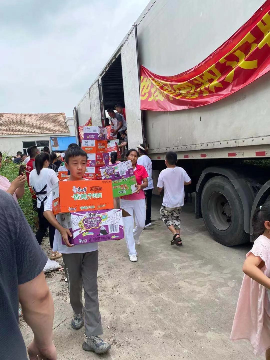 一輛滿載純凈水和食品等抗洪救災(zāi)物資的卡車(chē),