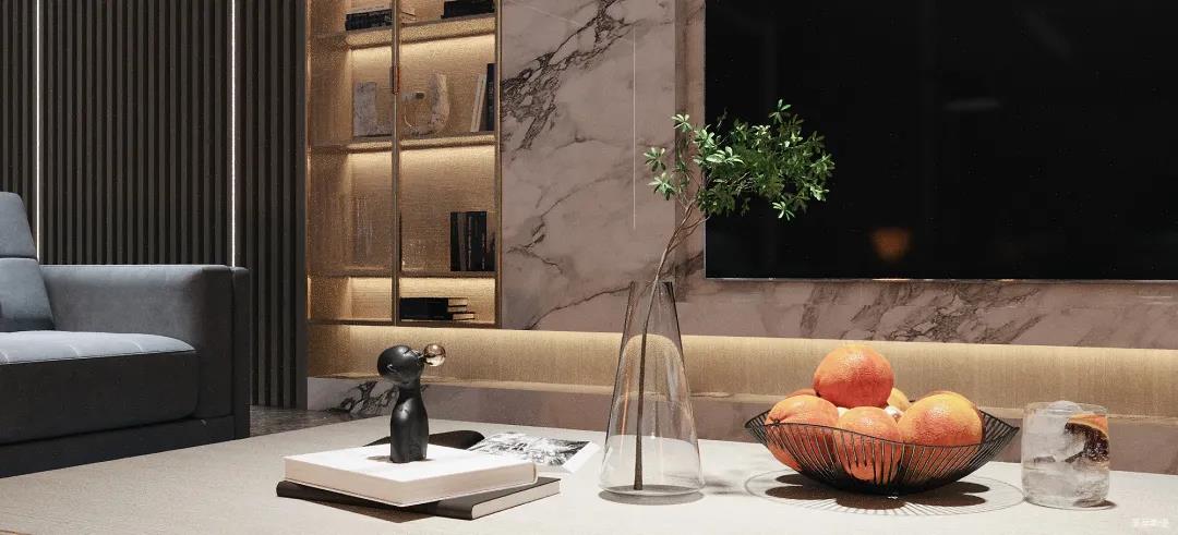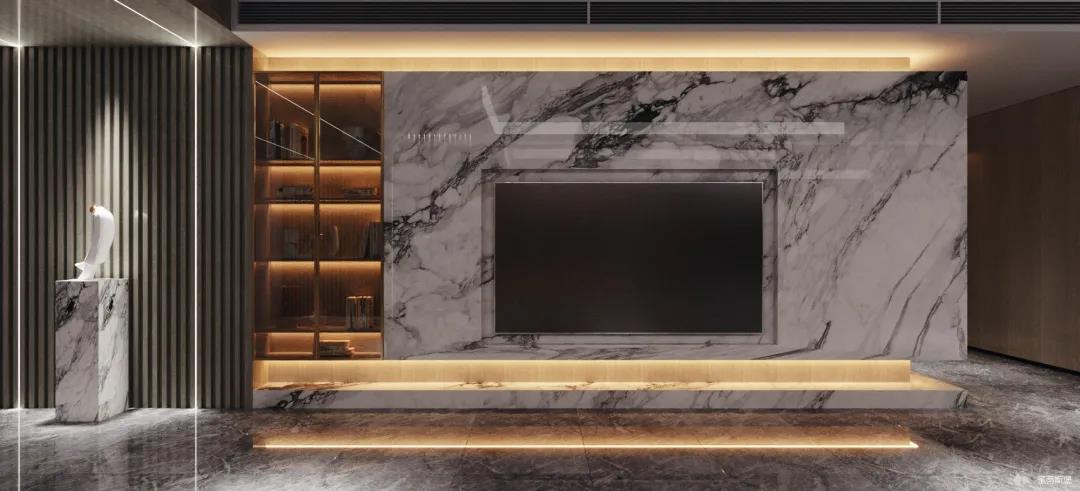 為了減輕現(xiàn)代都市工作的忙碌,客廳設(shè)計(jì)更偏向于對生活“解壓”的極簡,精選自然紋理的大理石與實(shí)木定制柜做一體化設(shè)計(jì),并在電視背景墻下半部分做挑空設(shè)計(jì),安裝個性十足的線性燈帶,延伸客廳視覺深度。