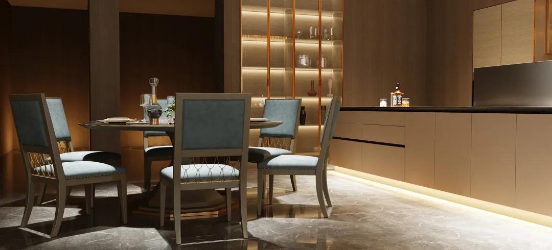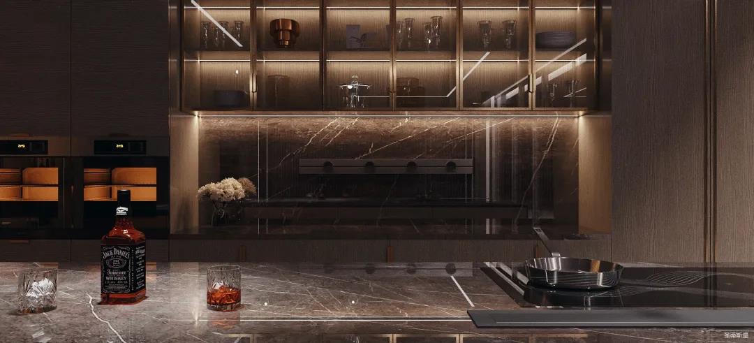 餐廚的極簡也可兼具多元,以一字內(nèi)嵌式展開的廚區(qū)收納柜,兼顧了從杯具、調(diào)料等廚用材料收納到廚電歸置動線功能處理。在展示區(qū)域,玻璃隔板組合實(shí)木定制柜的表現(xiàn)形式,更是提升了空間的明亮度與寬闊感。