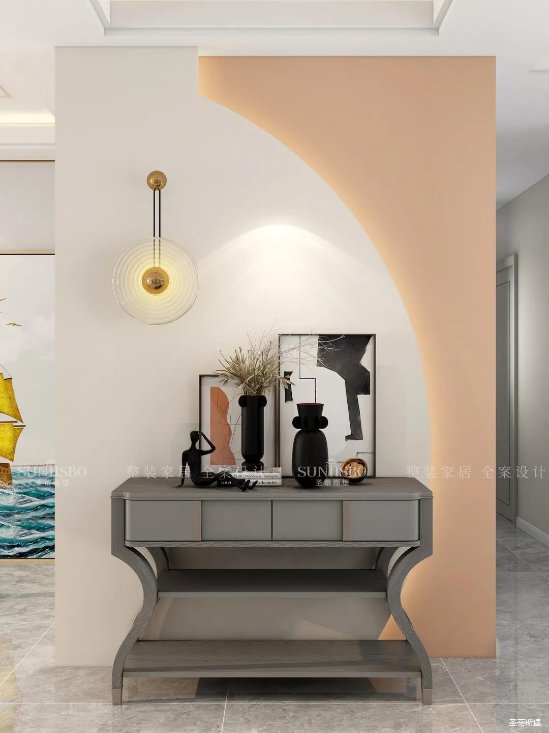 入戶(hù)玄關(guān)立體抽象裝飾物的擺設(shè),和幾何藝術(shù)畫(huà)相互搭配,藝術(shù)感滿分。黑白色的經(jīng)典搭配凸顯質(zhì)感,淺橙與白色墻面間安裝燈帶,既溫暖了入戶(hù)氛圍,也增加了空間的層次感。