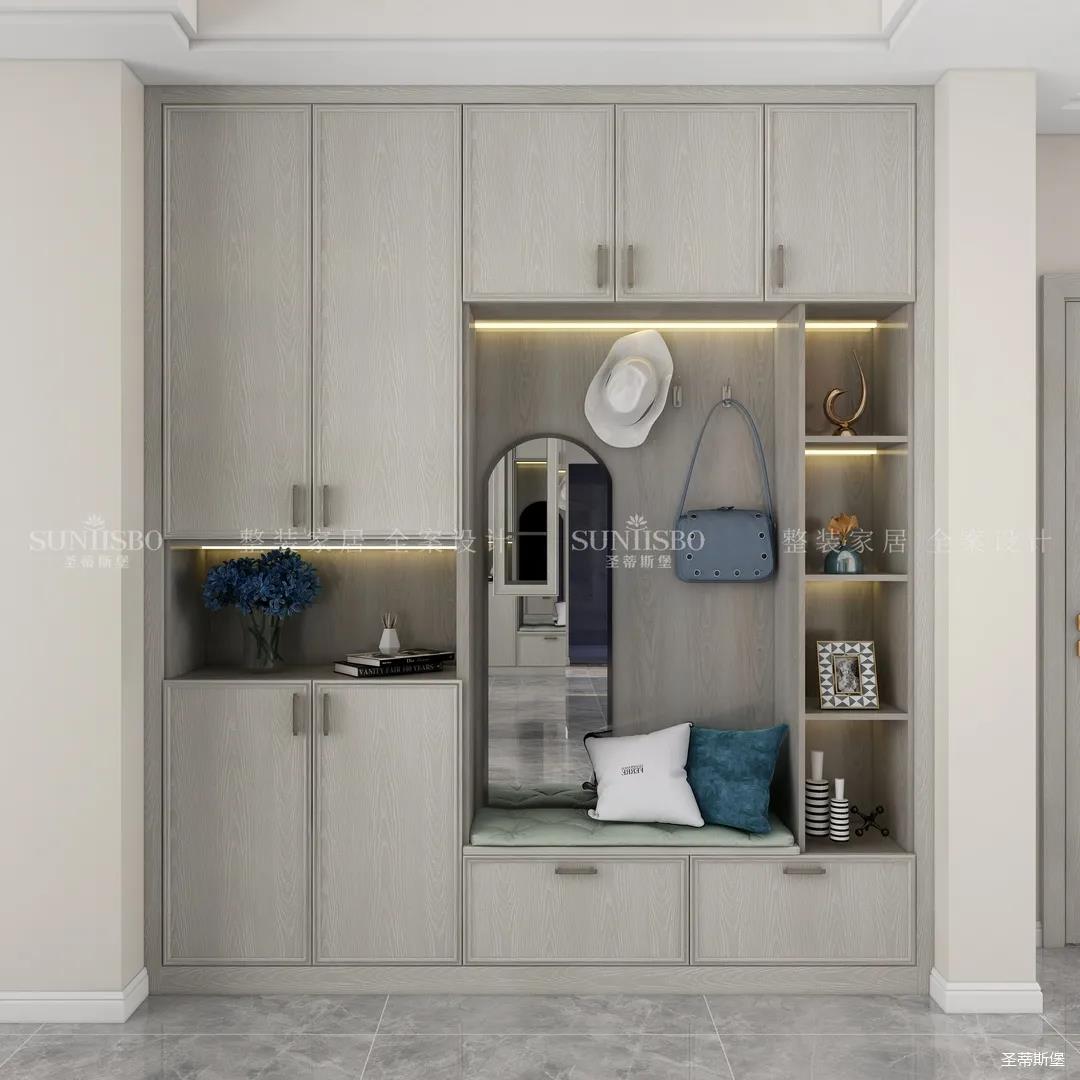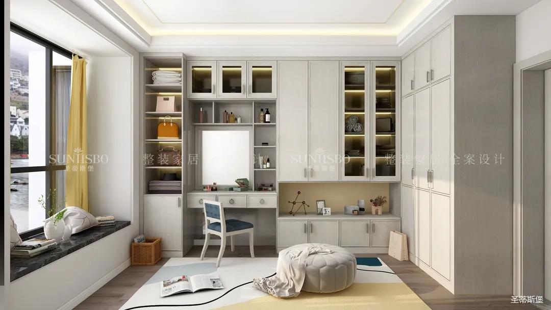 衣帽間是女主特別要求的,設(shè)計(jì)是將房間打造成衣帽間系統(tǒng),采用L型布局,壁掛式設(shè)計(jì),讓穿搭動(dòng)線更順暢,視覺(jué)上也更通透,可直觀的展示女主人穿搭品味。玻璃層板與背板花色的結(jié)合,精致靈動(dòng),成為時(shí)尚與輕奢的寫(xiě)照,封閉區(qū)衣柜的合理格局規(guī)劃,完美詮釋現(xiàn)代輕奢風(fēng)于當(dāng)代定制中的前瞻性。