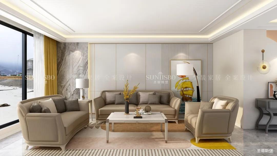 客廳設(shè)計(jì)置頂展示柜和大理石,實(shí)現(xiàn)了現(xiàn)代和輕奢風(fēng)格間的均衡組合。溫柔莫蘭迪色調(diào)的沙發(fā),細(xì)節(jié)的實(shí)木底座和人性化的環(huán)抱式設(shè)計(jì)讓空間更添溫馨的氣息。