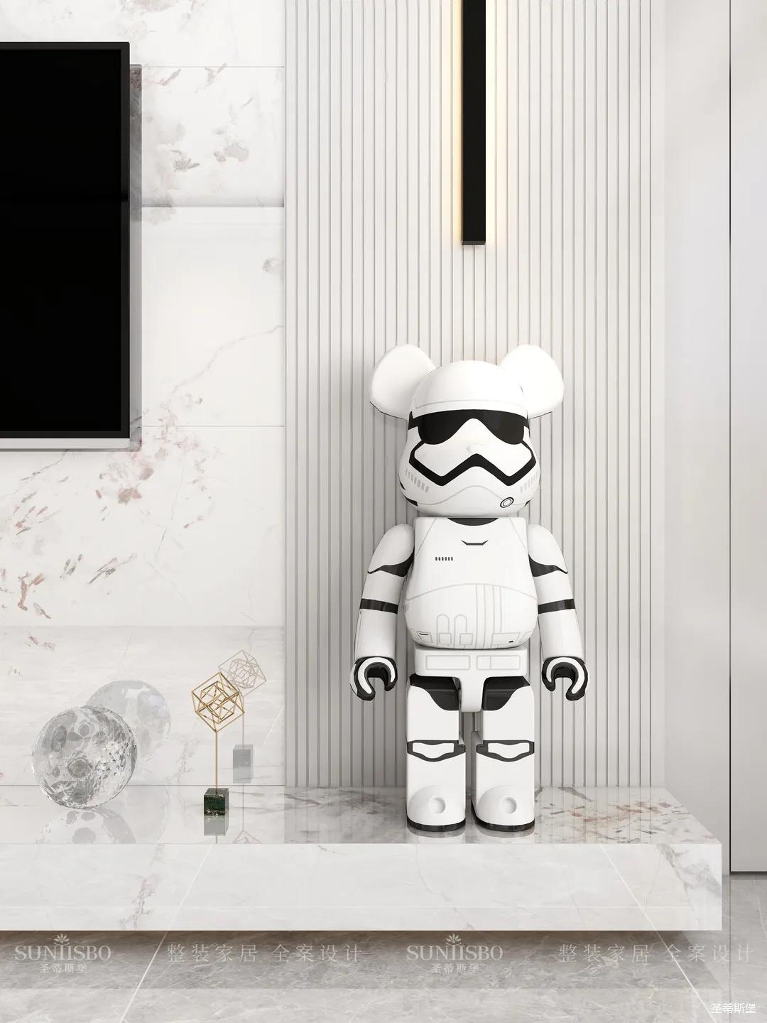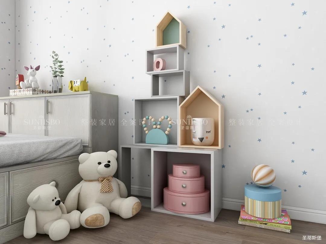 兒童房摒棄了傳統(tǒng)榻榻米的呆板與嚴(yán)肅,延續(xù)主臥輕奢雅致的空間氛圍,以木質(zhì)為主材質(zhì),利用面板的線條帶來(lái)視覺(jué)上的延伸,將童趣與理性相融表現(xiàn)兒童應(yīng)有的學(xué)習(xí)氛圍與生活習(xí)慣。開(kāi)放式展示區(qū)應(yīng)用藍(lán)色點(diǎn)綴,再次強(qiáng)化了空間專(zhuān)屬兒童的活躍格調(diào),也呈現(xiàn)了設(shè)計(jì)師在材質(zhì)與色彩運(yùn)用上的精細(xì)與專(zhuān)業(yè)。