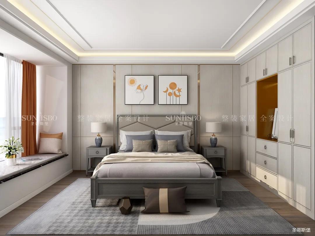 主臥隨著優(yōu)雅的金屬線條鋪開(kāi),臥室內(nèi)的靜謐感有序的傳遞著,帶有溫度的木飾面與溫潤(rùn)的實(shí)木地板在同一空間交匯,充滿輕奢質(zhì)感。明亮橙的色彩點(diǎn)綴讓空間活躍的格調(diào)不斷擴(kuò)充,仿古白的定制柜體在空間形成若隱若現(xiàn)的視覺(jué)平衡,將溫暖,柔和組合成日常的睡眠氛圍。