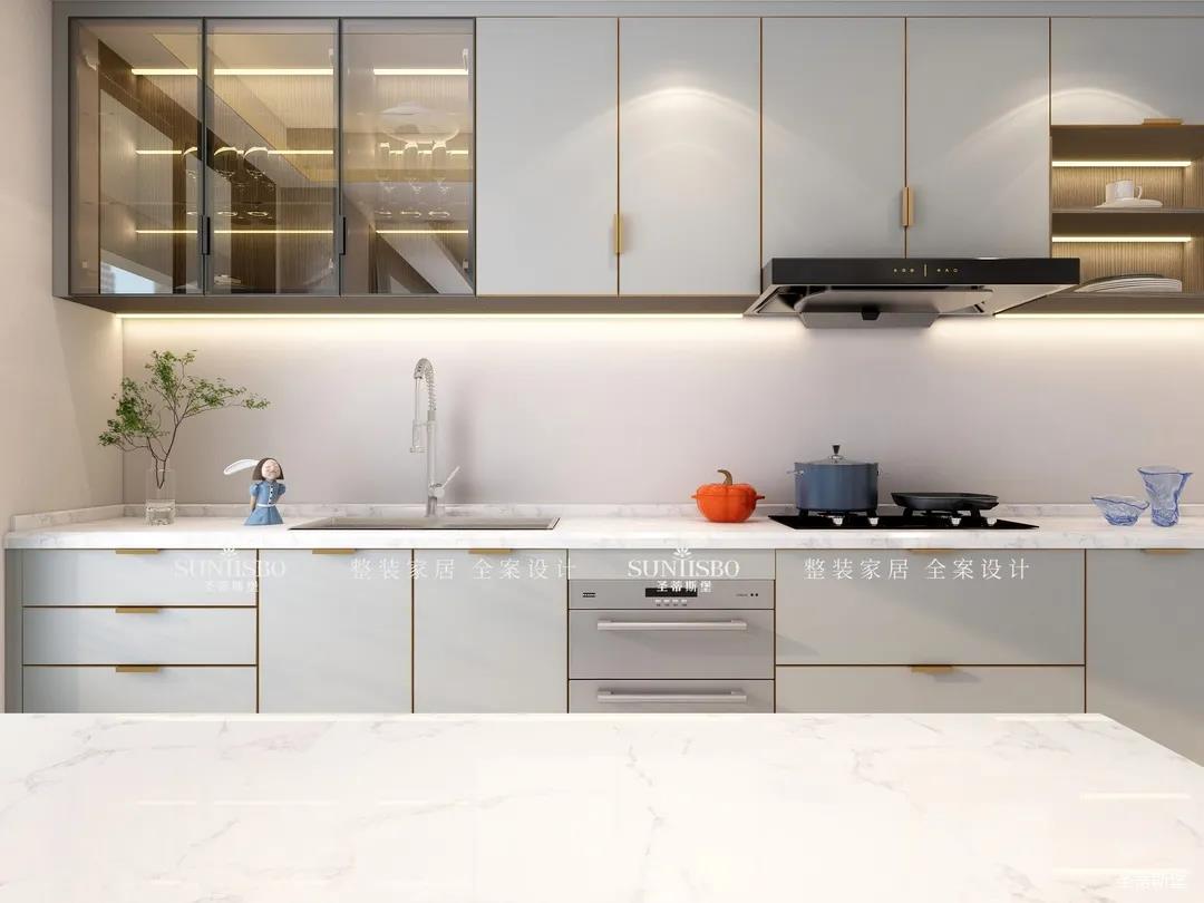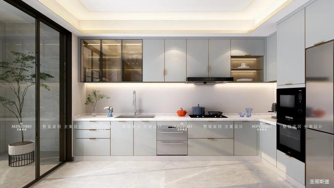 廚房現(xiàn)代智能的設(shè)計對精致生活進行了全新的詮釋,同時也呈現(xiàn)了居者追求精簡生活的內(nèi)涵。智能的廚房電器嵌入同色系的柜體中,時尚科技感十足。