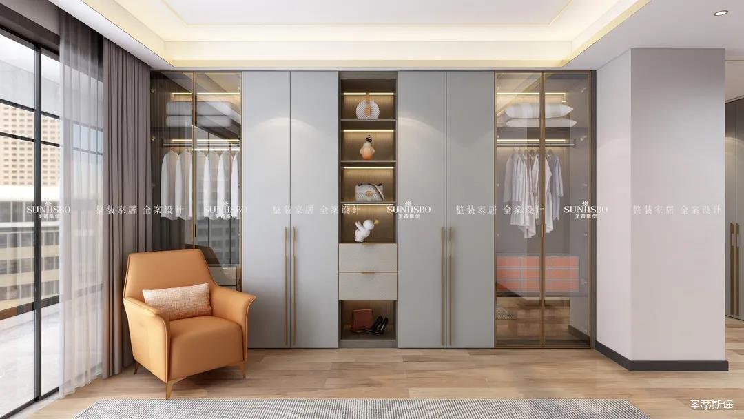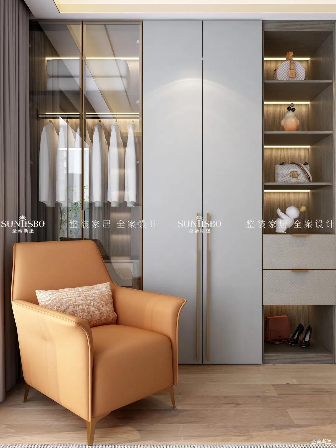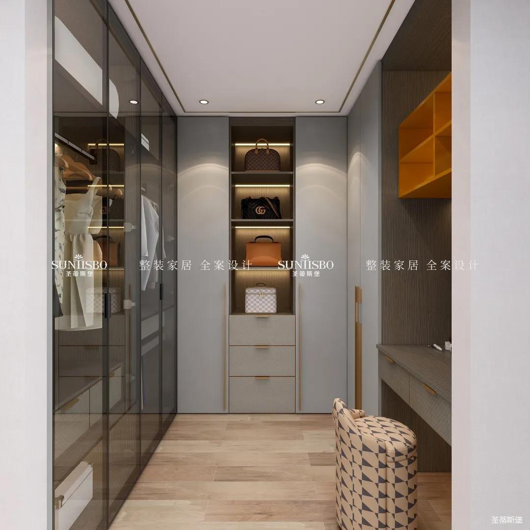 衣帽間選擇淺灰作為空間主色調(diào),設(shè)計師在衣帽間用與整體空間相似的愛馬仕橙作為點綴,使空間具有“簡于形,奢于心”的時尚審美內(nèi)涵。