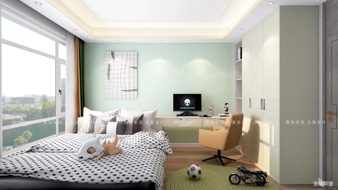 兒童房是清新的淺綠格調(diào),時尚個性又不失溫馨舒適。衣柜與墻體深淺色完美匹配整體硬裝,協(xié)調(diào)統(tǒng)一。黑白圓點棉質(zhì)床品與壁畫形成同色系搭配,充盈了空間的飽滿度。