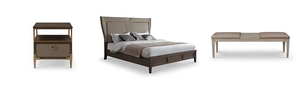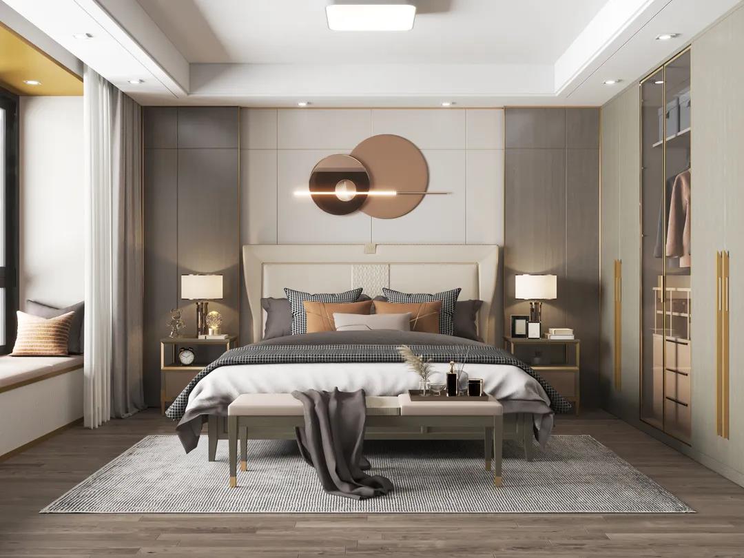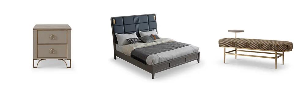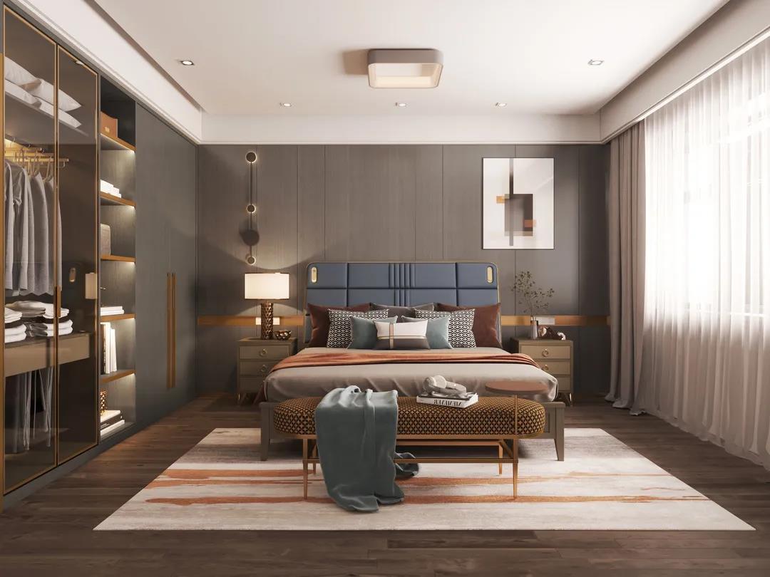 床屏?xí)r尚的霧霾藍(lán)色,與素雅的床品營造出一種低調(diào)的簡奢氛圍。金屬點綴著柜體拉手,床尾凳、床頭柜等微小細(xì)節(jié),讓生活充滿著內(nèi)在涵養(yǎng)與力量。