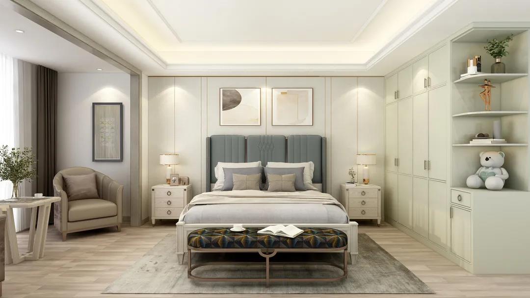 次臥背景墻兩端是對(duì)稱式設(shè)計(jì),以淡雅的暖色為主,
